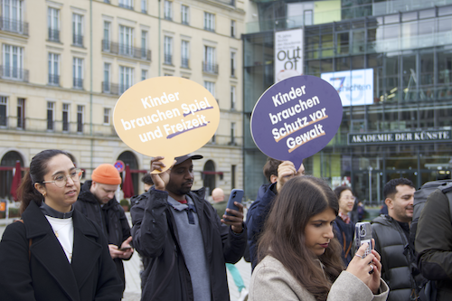 سازمانهای مدافع حقوق بشر از جمله Pro Asyl و Terre des Hommes، امروز در ساعت ۱۲:۳۰ در مقابل دروازه براندنبورگ تجمع کردند. معترضان با یک خرس عروسکی بزرگ در این مکان حاضر شدند و از نمایندگان پارلمان خواستند که حقوق کودکان و حقوق بشر را در اجرای اصلاحات رعایت کنند.