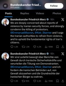 فریدریش مرتس، صدراعظم آلمان، روز گذشته، ۹ ژانویه، پس از گذشت حدود دو هفته با پیامی در پلتفورم X به سرکوب مردم توسط جمهوری اسلامی واکنش نشان داد. او گفت: «ما عمیقا نگران گزارش‌ها درباره اعمال خشونت توسط نیروهای امنیتی ایران هستیم و قتل معترضان را به‌شدت محکوم می‌کنیم. @EmmanuelMacron، @Keir_Starmer و من از مقامات ایرانی می‌خواهیم از به‌کارگیری خشونت خودداری کنند و حقوق بنیادین شهروندان ایران را محترم بشمارند.»
