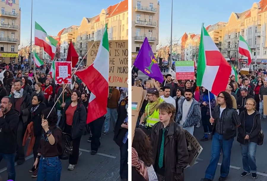 شنبه، ۷ مارس، تظاهرات بزرگ «نه به جنگ» در برلین برگزار شد. در بیانیه آن آمده است: «به خیابان میآییم، تا از جان عزیزانمان که توسط قاتلان به گروگان گرفته شده، دفاع کنیم. تا بگوییم که ما از میان قاتلانمان انتخاب نمیکنیم. که در میان فریاد جنگطلبان و آتشافروزان خارجی و داخلی که میخواهند جان مردم را به «شهید» و«هزینه لازم برای هدفی بزرگتر» تبدیل کنند، میایستیم. هر لحظه ادامهی این جنگ خونین و تداوم حاکمیت خونخوار جمهوری اسلامی، زندگی را برای مردم دشوارتر و امکان زیستن را ناممکنتر میکند. پس کنار هم میایستیم تا بلند فریاد بزنیم: نه به جنگ! نه به مداخلهگری نظامی! نه به جمهوری اسلامی!»