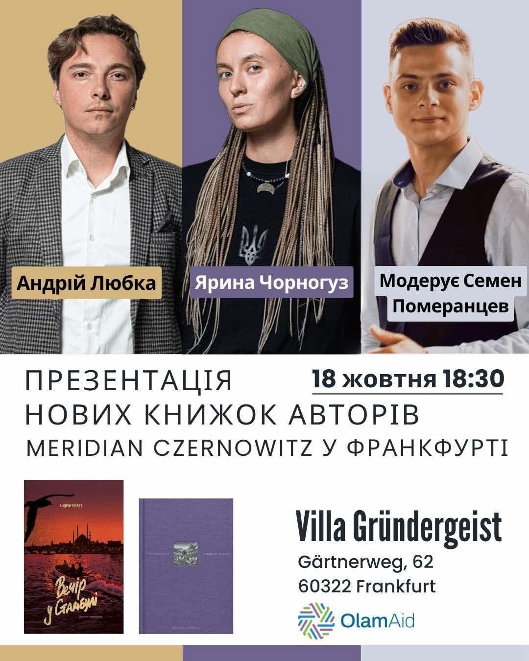 Захід відбудеться у суботу, 18 жовтня о 18:30, в приміщенні Villa Gründergeist (Gärtnerweg, 62, 60322, Frankfurt) за підтримки Міжнародної літературної корпорації Meridian Czernowitz та гуманітарної організації OlamAid e.v.