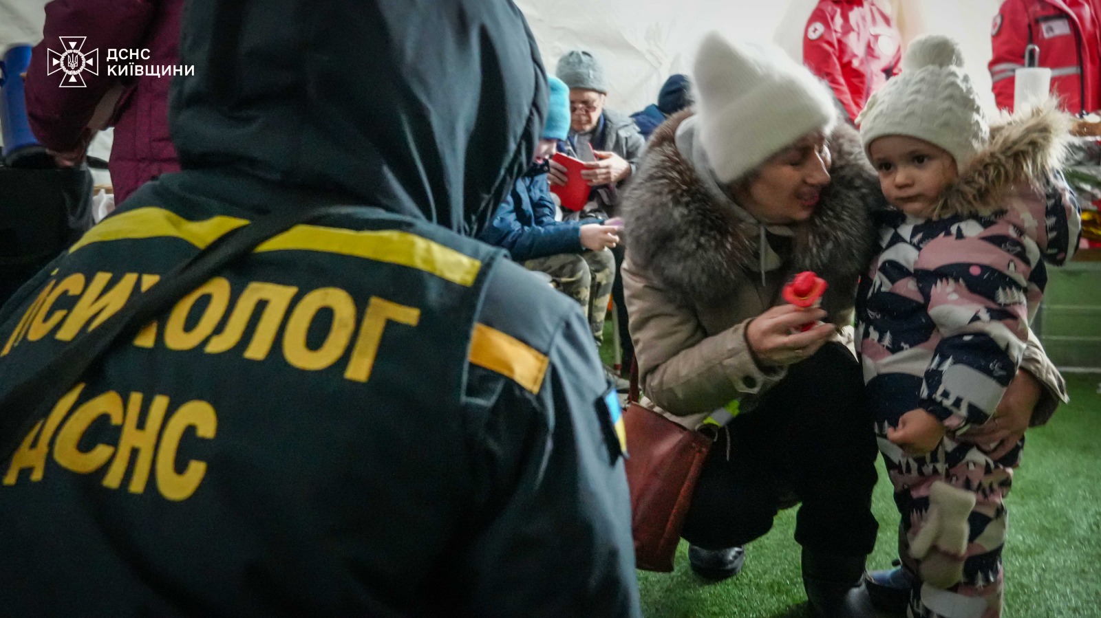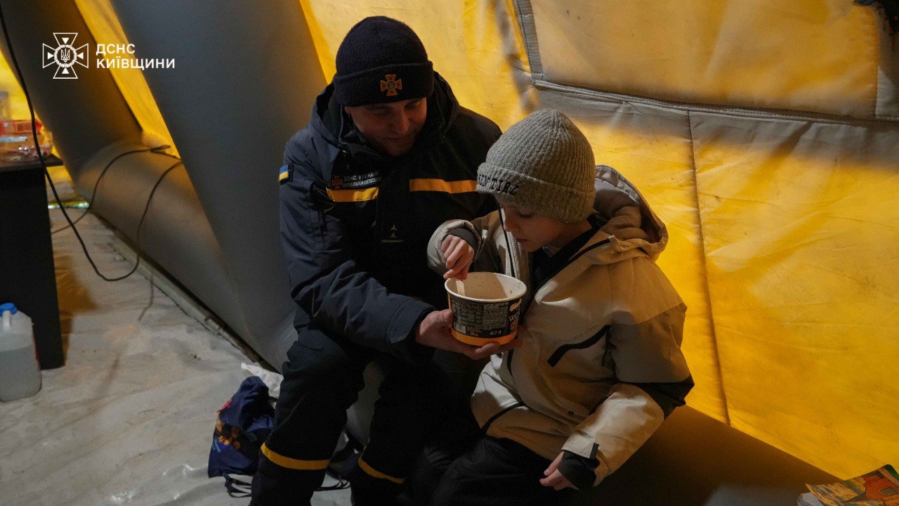 29 грудня 2025 року, Вишгород. Співробітник ДСНС годує дитину у пункті незламності. Місто третю добу без тепла й світла після чергової атаки РФ на енергетичну інфраструктуру України. Фото – ДСНС Київщини