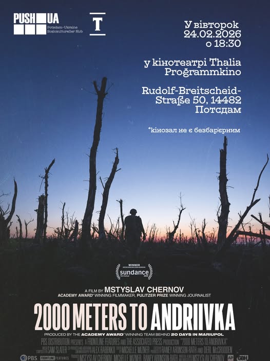 24 лютого команда ГО PUSH-UA e.V. запрошує українців Потсдама разом переглянути документальну стрічку “2 000 метрів до Андріївки” Мстислава Чернова, автора оскароносного фільму “20 днів у Маріуполі”.