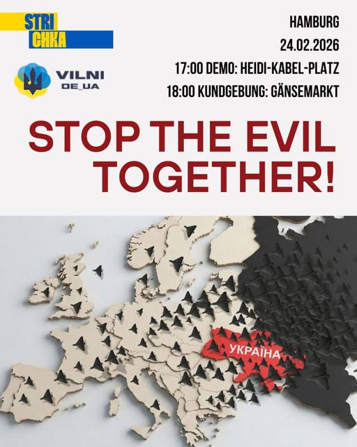 24 лютого 16:30 українці Гамбурга та німецькі друзі збираються на Хайді-Кабель-Плац. О 17:00 почнеться хода, а о 18:00 відбудеться мітинг на Генземаркт.