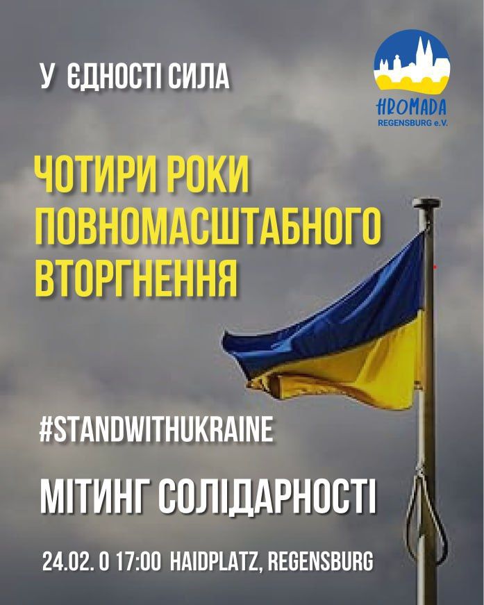 24 лютого о 17:00 вийдуть на вулиці й українці Реґенсбурґу, що у Баварії. “З 2014 року Україна бореться за свободу – всі ці роки українці захищають свою землю та цінності всього демократичного світу. Ця боротьба триває й сьогодні. Україна потребує постійної підтримки! Мир можливий лише разом зі свободою. Приходьте на демонстрацію, щоб показати: Україна має сильну міжнародну підтримку. Ми разом – і продовжуємо шлях до справедливості та перемоги України”, – заявляють організатори.