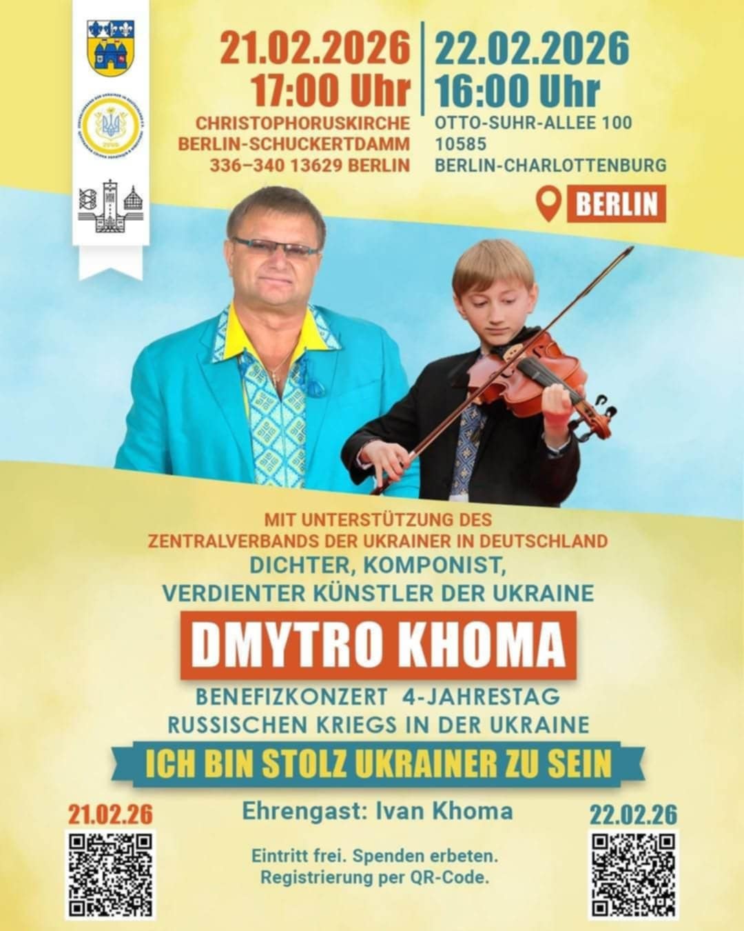 У Берліні пройдуть два благодійні концерти українського поета, композитора та заслуженого артиста України Дмитра Хоми, присвячені четвертій річниці повномасштабної війни Росії проти України. Музичні вечори відбудуться під гаслом Ich bin stolz Ukrainer zu sein (“Я пишаюся бути українцем”). Перший концерт – 21 лютого о 17:00 у храмі Christophoruskirche Berlin-Schuckertdamm. Другий виступ – 22 лютого о 16:00 у районі Шарлоттенбург за адресою Otto-Suhr-Allee 100 у Berlin.