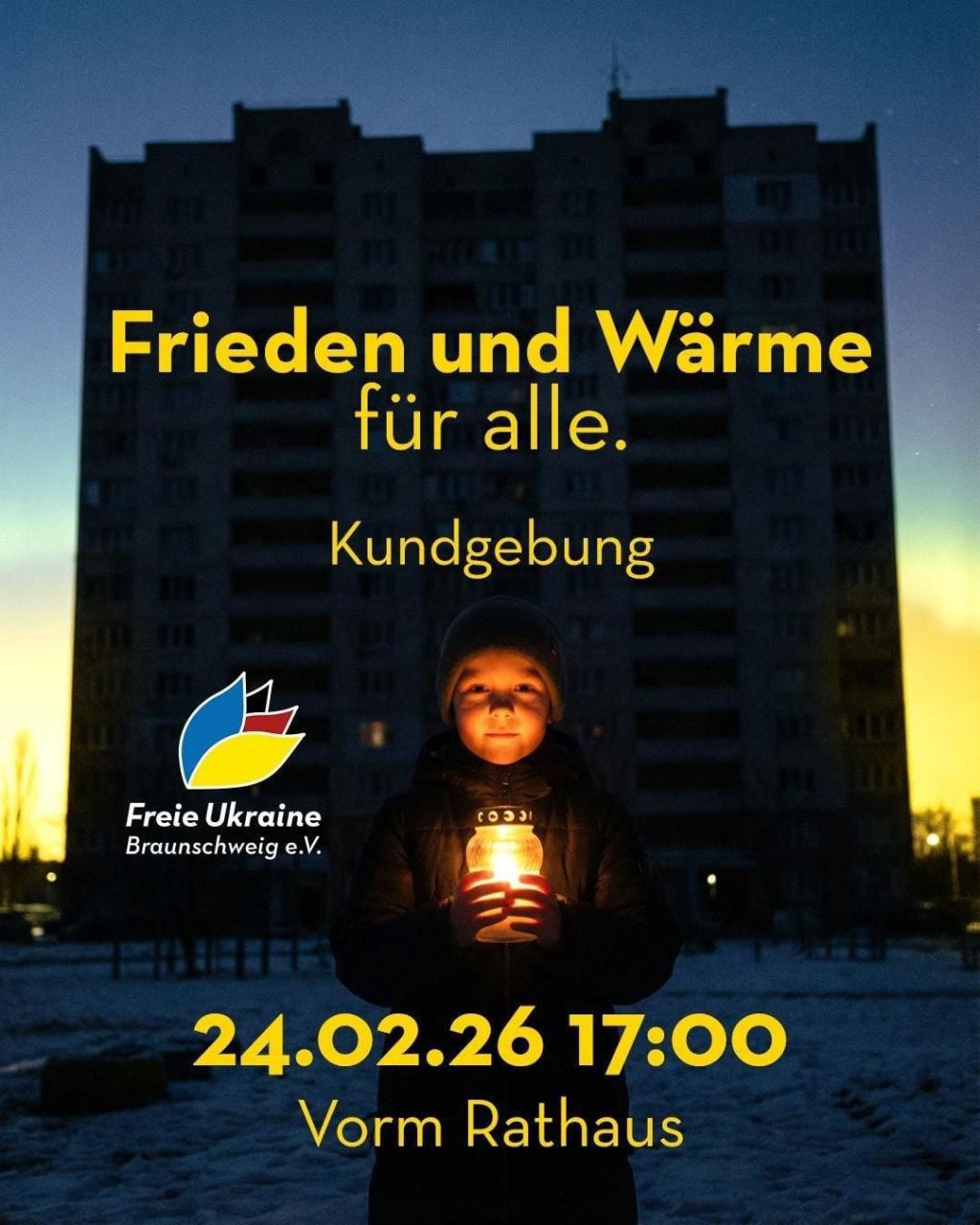 24 лютого з 17:00 до 18:30 – загальні збори перед ратушею міста Брауншвайг, що у Нижній Саксонії. Відбудеться мітинг і спільний флешмоб. Учасники отримають від організаторів сині та жовті дощовики і всі разом створять прапор України. А коли сонце сяде, учасники мітингу запалять ліхтарики своїх телефонів як символ світла пам’яті.