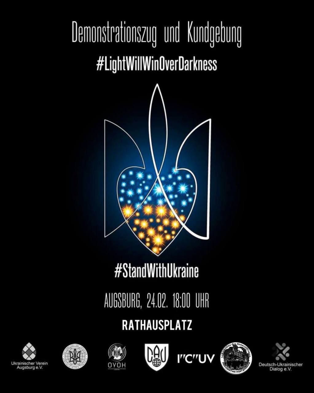 24 лютого о 18:00 вийдуть на демонстрацію й активні українці Ауґсбурґа та його околиць. У зверненні до громади організатори закликають приносити “прапори, ліхтарики, плакати і свій голос”. Колона рушить від Ратушної площі.