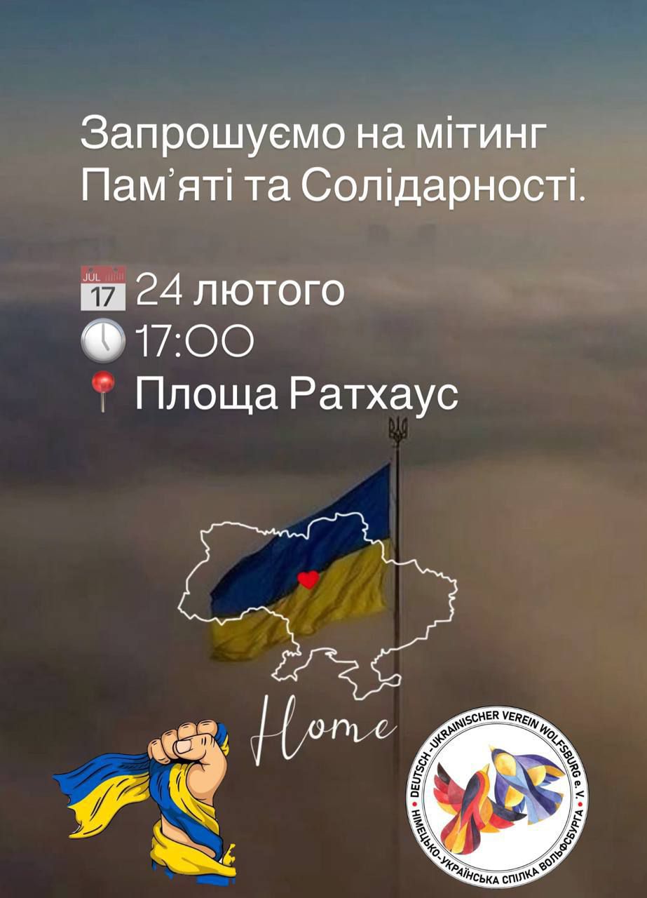 24 лютого о 17:00 на Ратушній площі українці Вольфсбурга зберуться разом, щоб нагадати, що “війна триває, і Україні й досі потрібні підтримка та справедливість. “Приходьте з прапорами, плакатами, – йдеться у заклику. – Разом – ми голос України”.