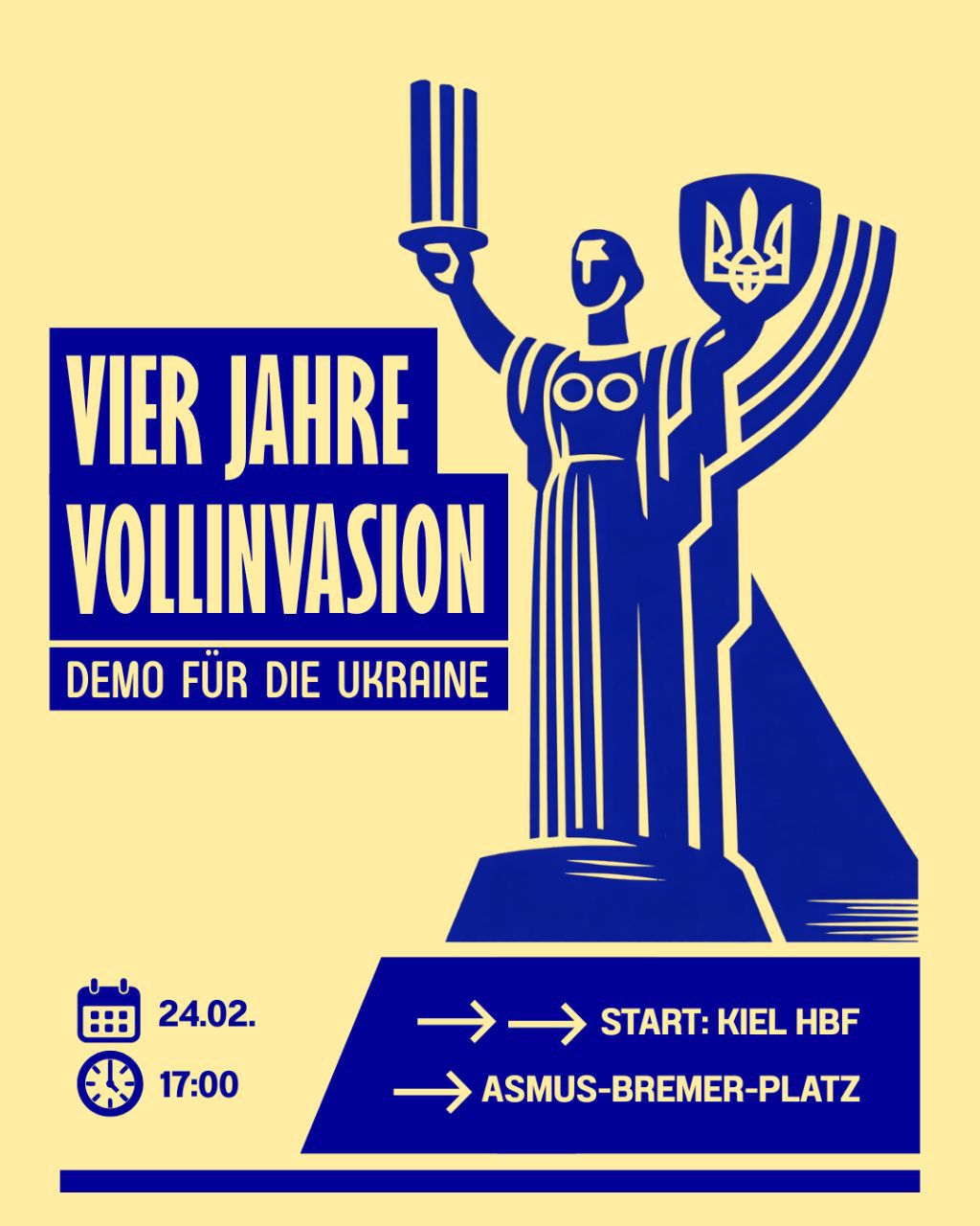 Активісти Кіля вважають, що вийти на демонстрації цього дня – вкрай важливо. “Це сигнал суспільству, медіа та політикам: підтримка України жива! Війна не стала “звичкою”, і ми не маємо права мовчати”, – пишуть вони у запрошенні для громади і просять мати з собою прапори. О 17:00 від Центрального вокзалу (Kiel Hbf) колона рушить до  Азмус-Бремер-Плац.