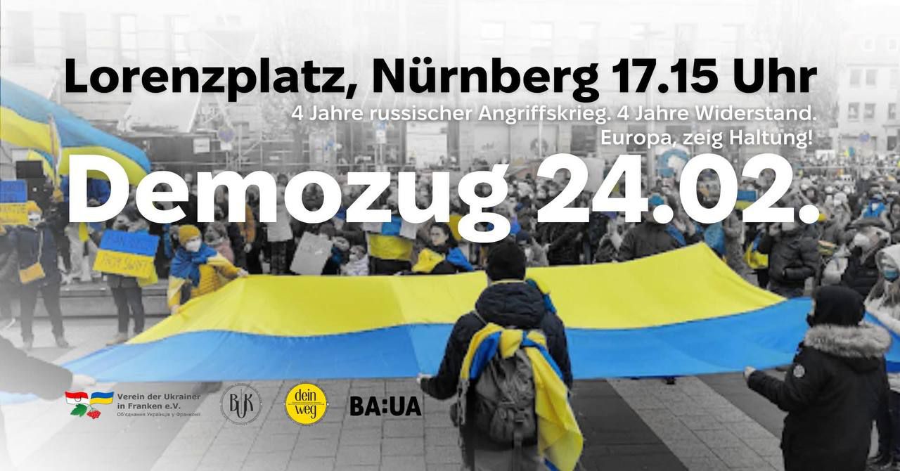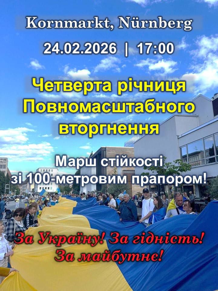 Вулицями Нюрнберга пронесуть 100-метровий прапор України. Організатори закликають усіх українців міста та регіону “показати характер” і 24 лютого вийти разом на Марш стійкості. Початок о 17:00.