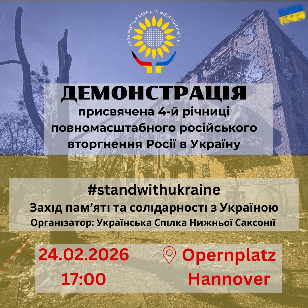 24 лютого Українська Спілка Нижньої Саксонії (Ukrainischen Vereins in Niedersachsen e. V.) запрошує на мітинг пам’яті та солідарності. Він відбудеться 24 лютого о 17:00 на Оперній площі.