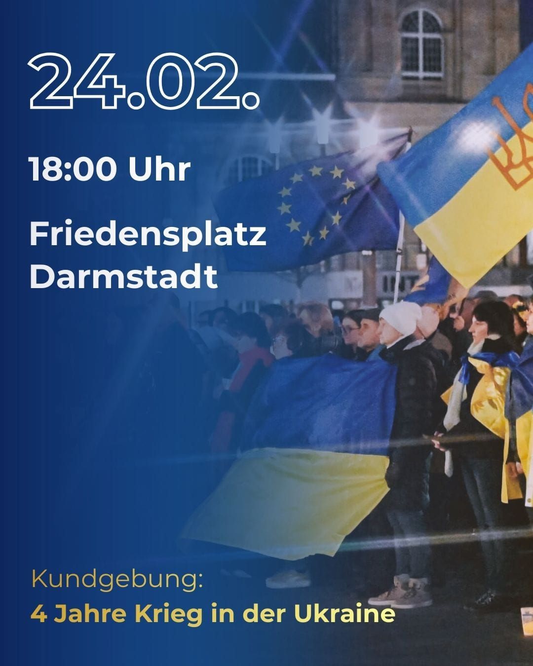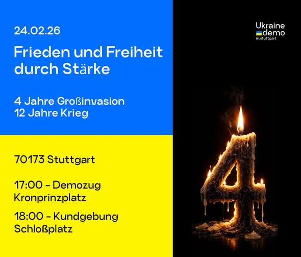 24 лютого, у “день, що масштабував війну, розпочату росіянами 12 років тому й зробив небезпечним кожен куточок території України” у Штутгарті оголосили демонстрацію та мітинг “Frieden und Freiheit durch Stärke” (“Мир і свобода завдяки силі”). Мета заходу – закликати партнерів до допомоги Україні, а також віддати шану всім загиблим і подати знак єдності з людьми в Україні”.