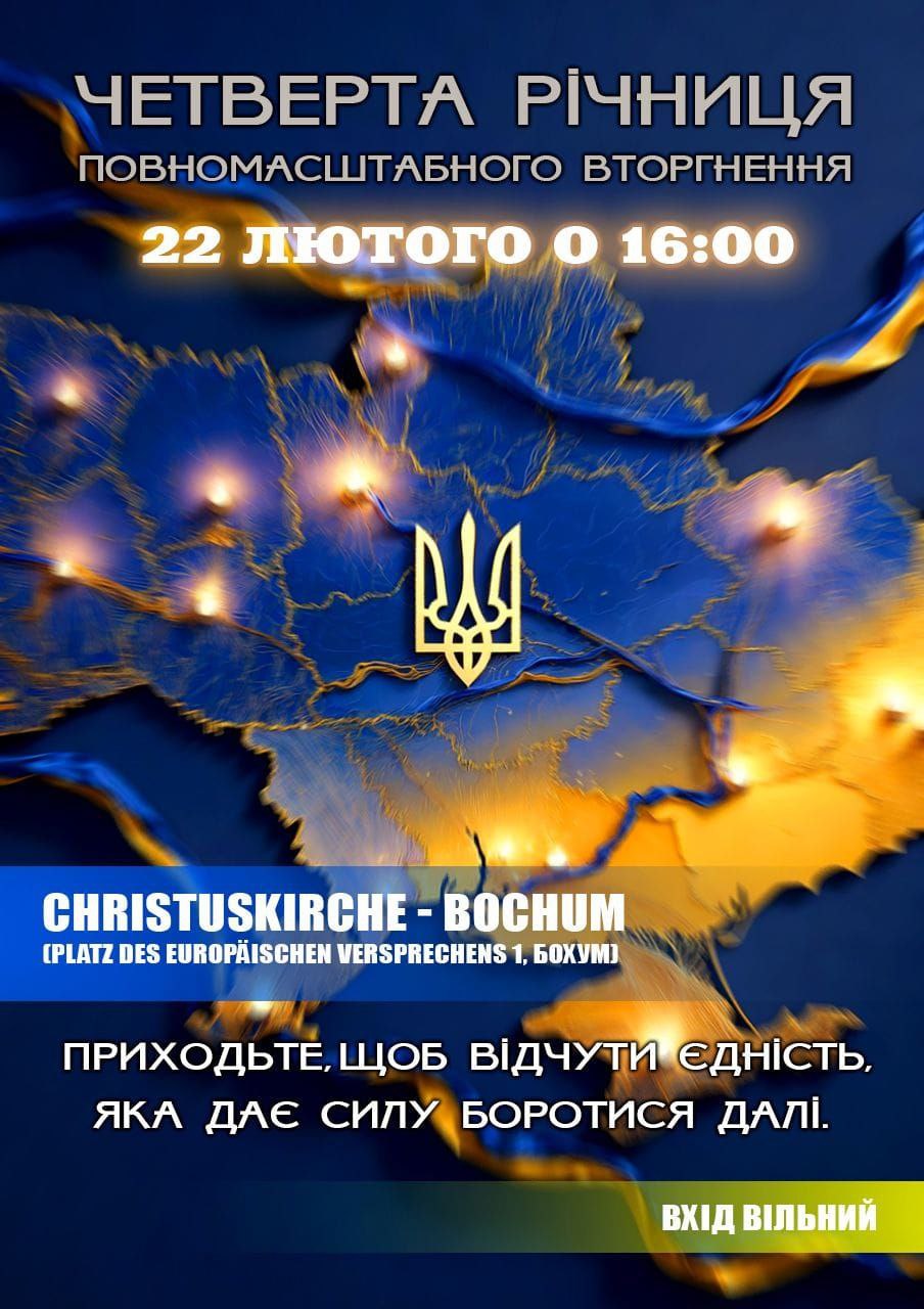 22 лютого о 16:00 у Бохумі, що у Північному Рейні-Вестфалії, активісти збираються у Christuskirche, “щоб говорити вголос про війну, яка триває і бути разом – у молитві, у солідарності, у надії”.