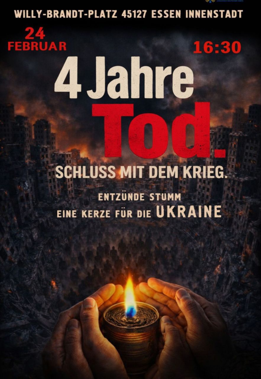 24 лютого активісти Ессена закликають всіх об’єднатися та стати пліч-о-пліч зі свічками в руках на площі Віллі Брандта. “Ми тут, у Німеччині, не байдужі біженці, – йдеться в оголошенні. – Ми – сила, голос і стовп нашої країни. Ми запалюємо свічки не як жест, а як знак присутності. Знак пам’яті. Знак відповідальності”.