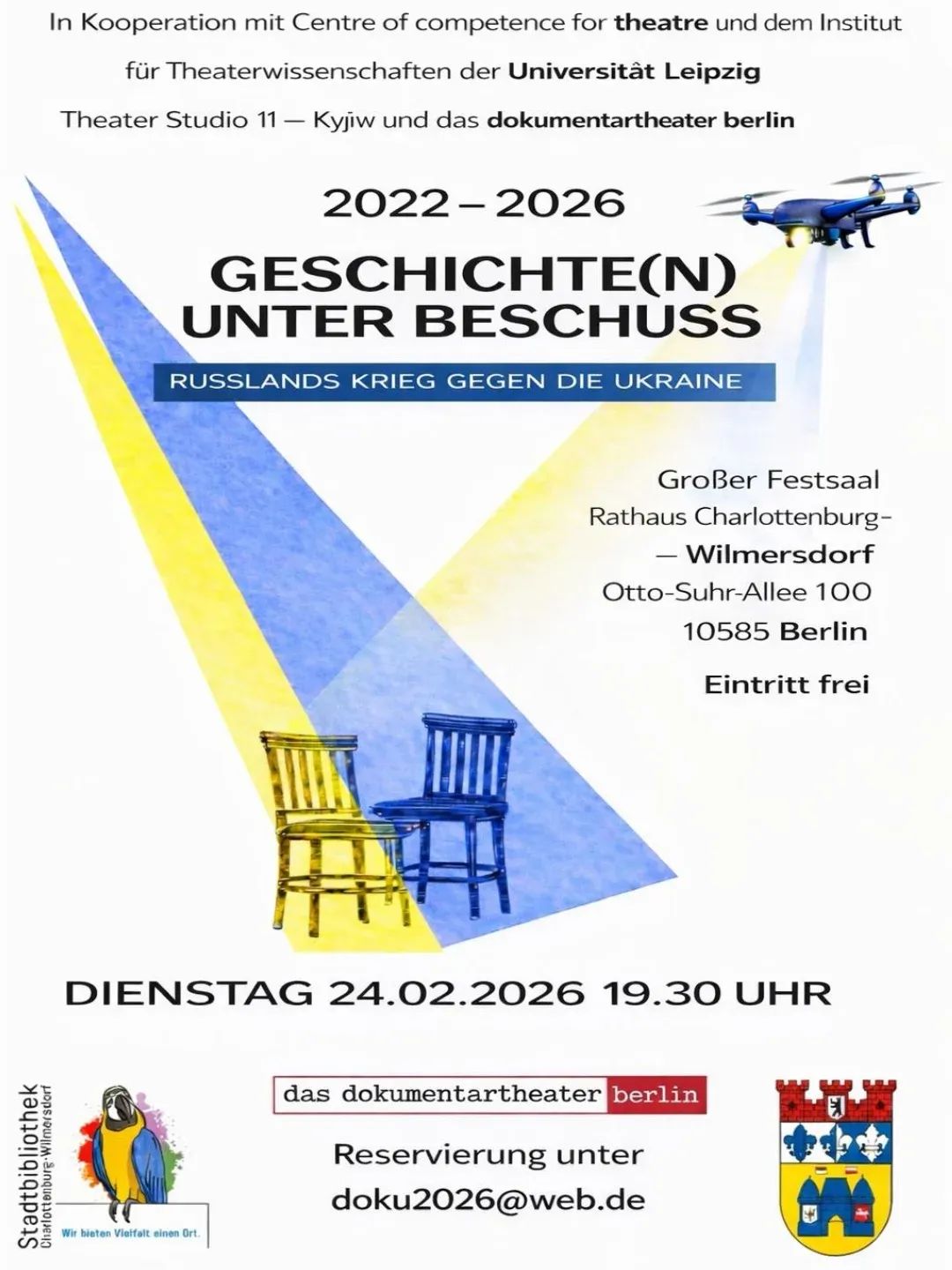 У вівторок, 24 лютого о 19:30 у головному залі для урочистостей мерії Шарлоттенбург-Вільмерсдорфа відбудуться театралізовані читання про історію України за 300 років. Виступ неординарний, адже його представляє “Документальний театр у Берліні” (das dokumentartheater berlin). Сценарії написала засновниця театру – українка Марини Шубарт. У його основі – історичні факти, документи та відеосвідчення, що зібрали її студенти під час студій у Ляйпцигу, де сценаристка та режисерка викладала основи документального театру.