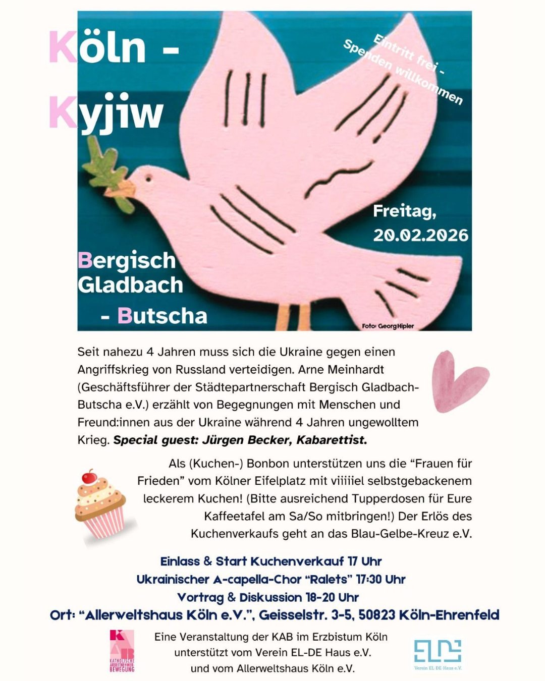 Неприбуткова організація Blau-Gelbes Kreuz e.V. у Кьольні запрошує у п’ятницю, 20 лютого, на особливий вечір – дискусію, концерт українського хору та благодійний продаж тістечок.