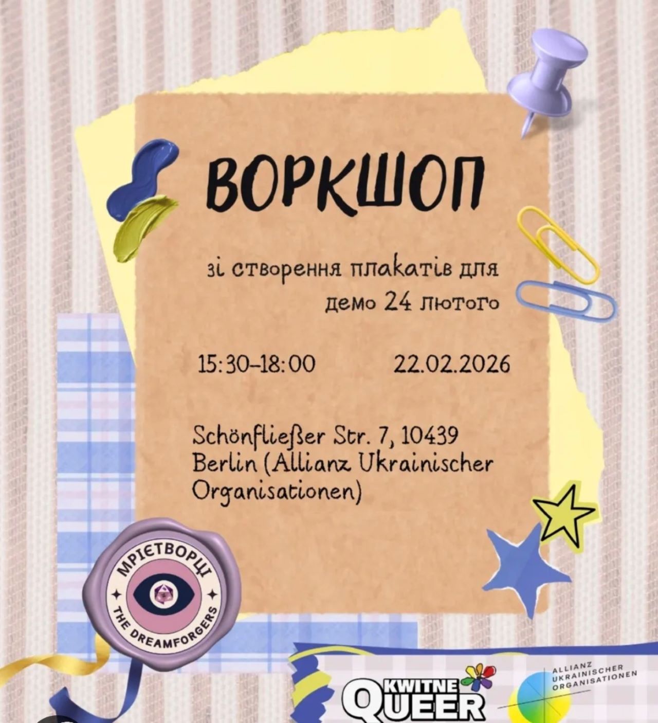 22 лютого з 15:00 до 18:00 у Берліні у приміщенні “Альянсу українських організацій” активісти створюють плакати для демонстрації, організованої Vitsche Berlin.